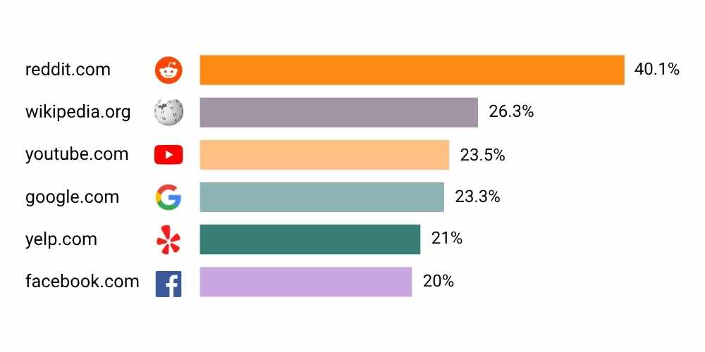 We zien dat veel mensen al vertrouwen op bijvoorbeeld ChatGPT. Maar is dat wel verstandig? Uit onderzoek van Semrush blijkt dat 40,1% van de informatie die ChatGPT ophaalt van Reddit komt, gevolgd door 26,3% van Wikipedia en 23,5% van YouTube. Zie de afbeelding hieronder voor de percentages. Je kunt je voorstellen dat je bij het zoeken naar betrouwbare HR-informatie niet te veel op dit soort tools wilt vertrouwen.