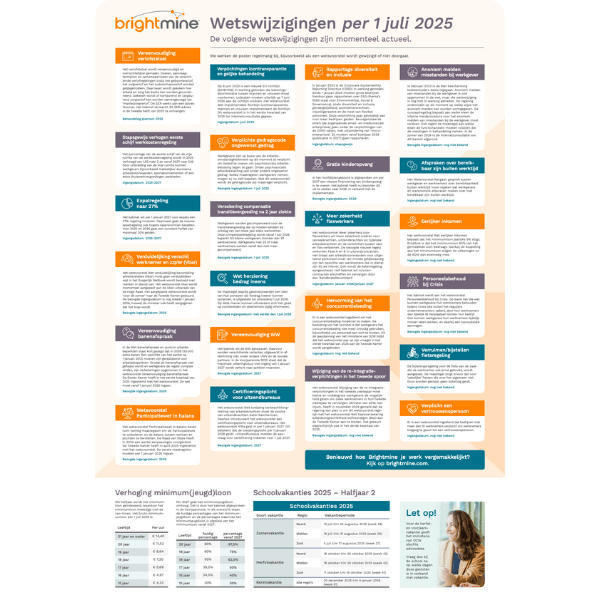Bij Brightmine hebben we de belangrijkste wijzigingen voor 2026 samengebracht in een compacte poster. Inclusief minimumlonen, schoolvakanties en een helder overzicht van alle relevante wetswijzigingen. Handig om te printen, te delen of op je werkplek op te hangen. Natuurlijk zie je hier niet de wetten die nog niet door zijn en krijg je hierbij geen content en acties. Toch vinden onze abonnees dit altijd een handig document om te hebben.